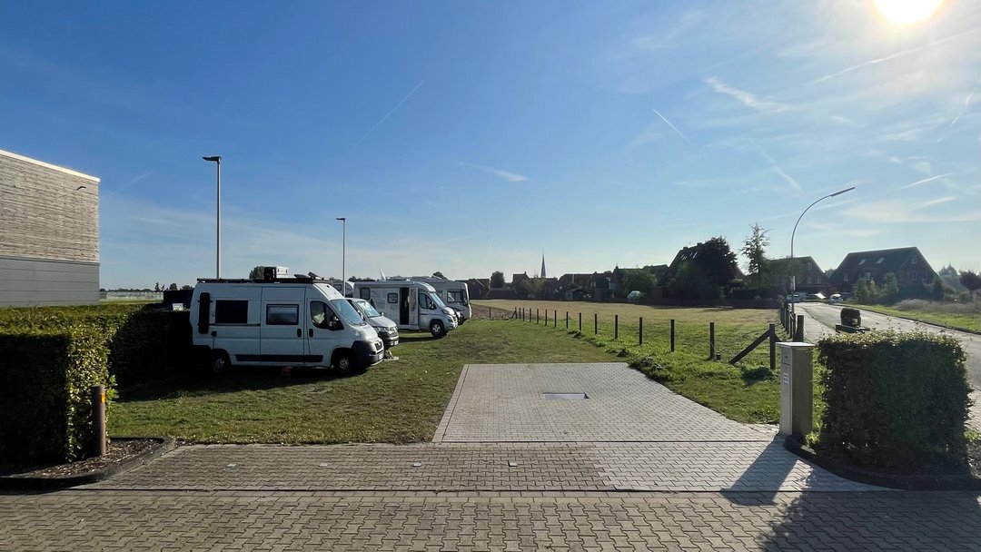 3 Plätze, Untergrund gepflastert, keine Parkgebühren; Frischwasserversorgung, 3x Stromanschluss und Entsorgung für Abwasser und Chemikaltoilette an der Wohnmobilsäule